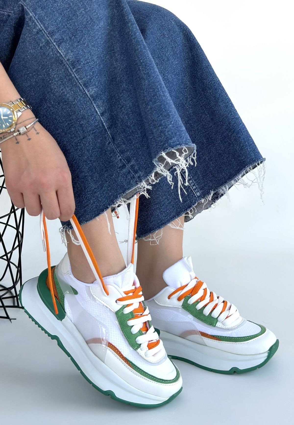 • Aleh Beyaz Cilt Yeşil Detaylı Çift Bağcıklı Spor Ayakkabı