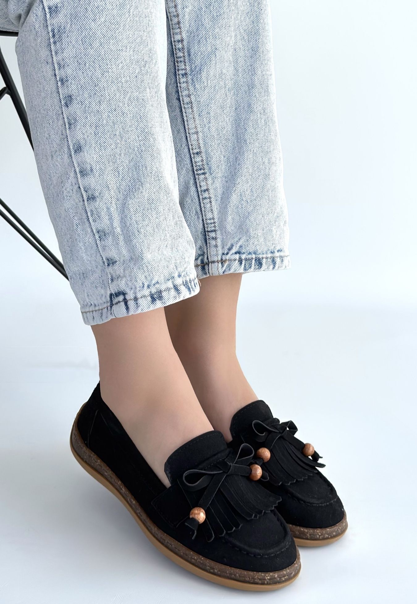 Boriy Siyah Deri Tozu Süet Babet Ayakkabı
