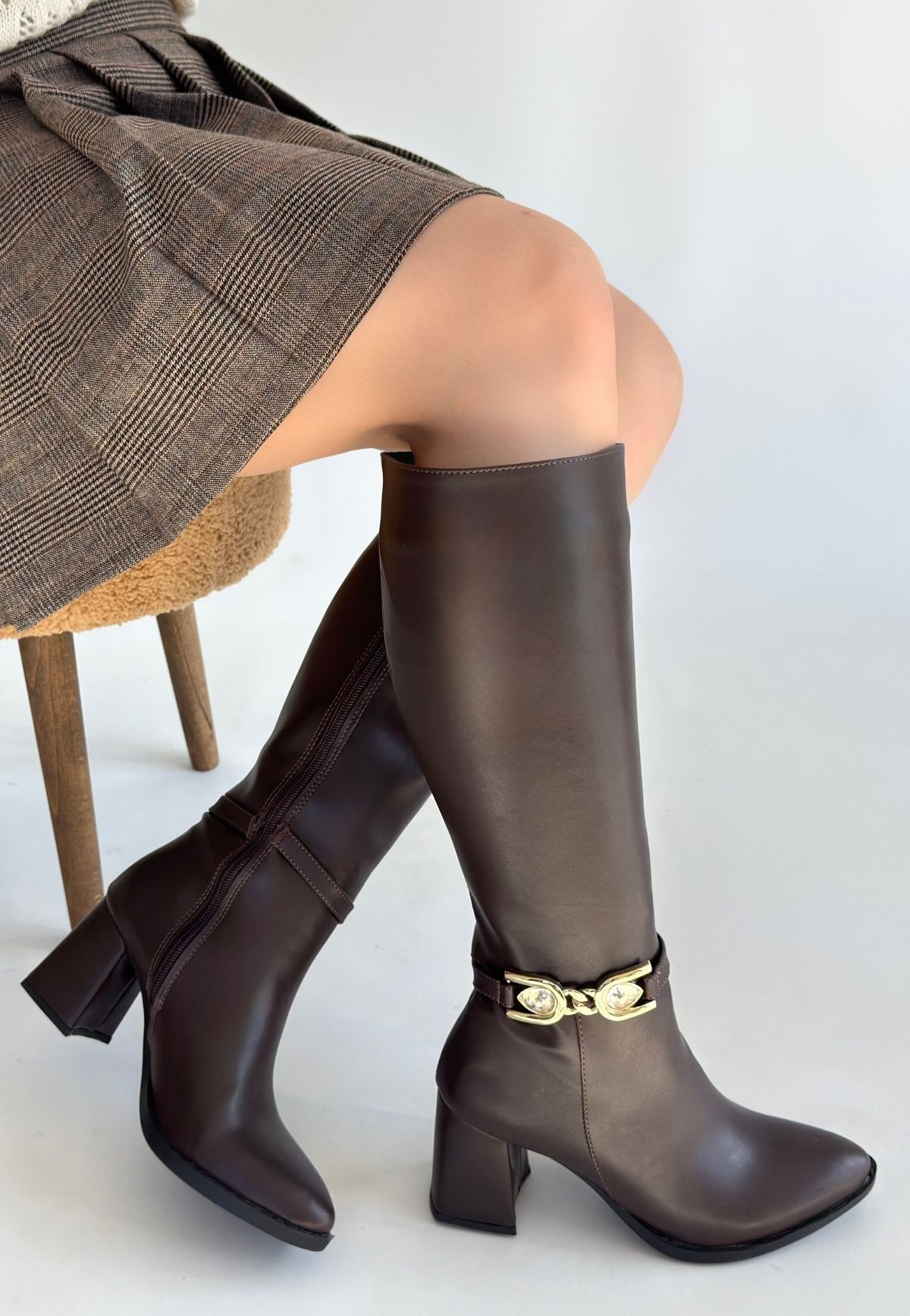 Çizme Mooni Kahverengi Cilt Topuklu Çizme