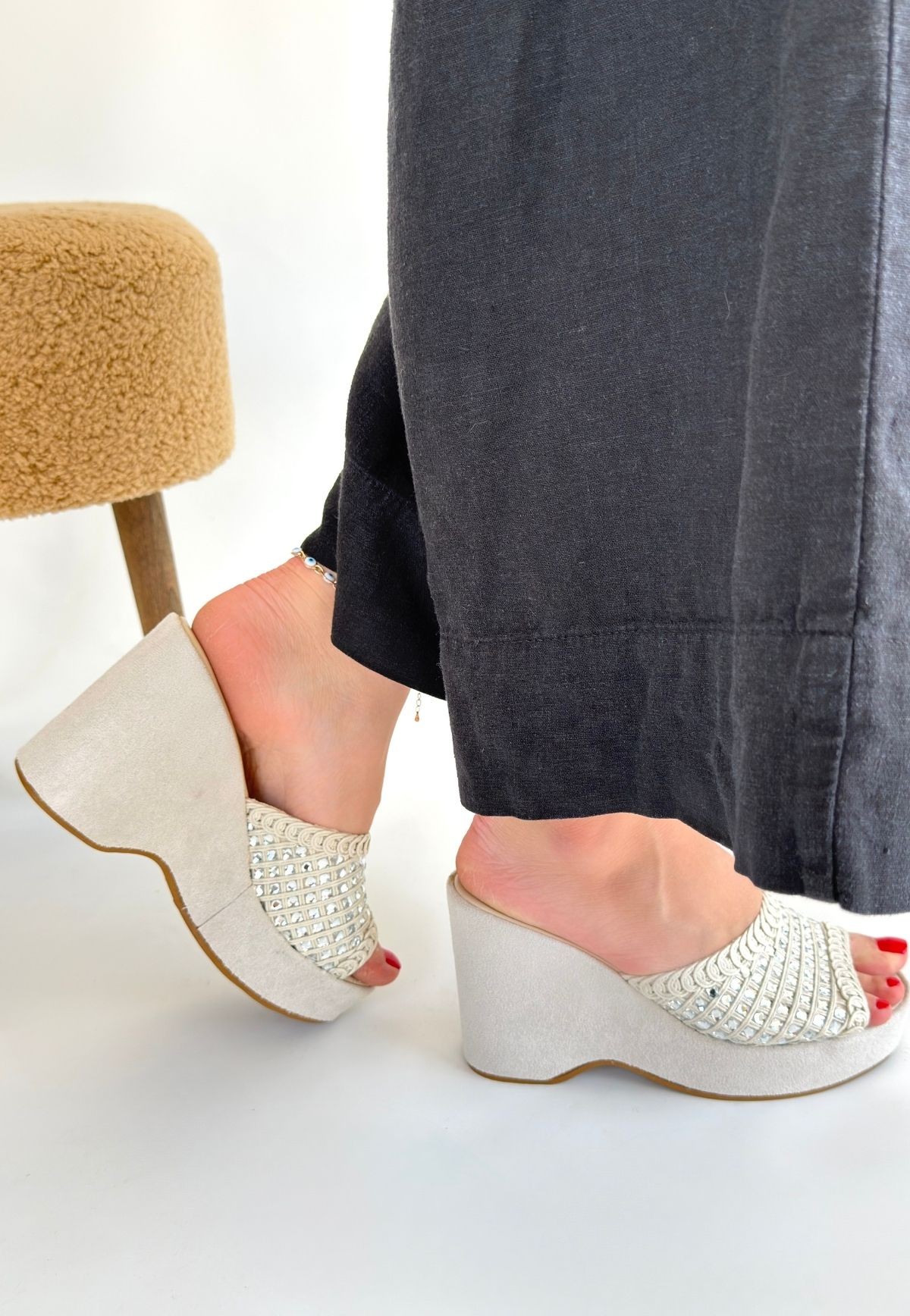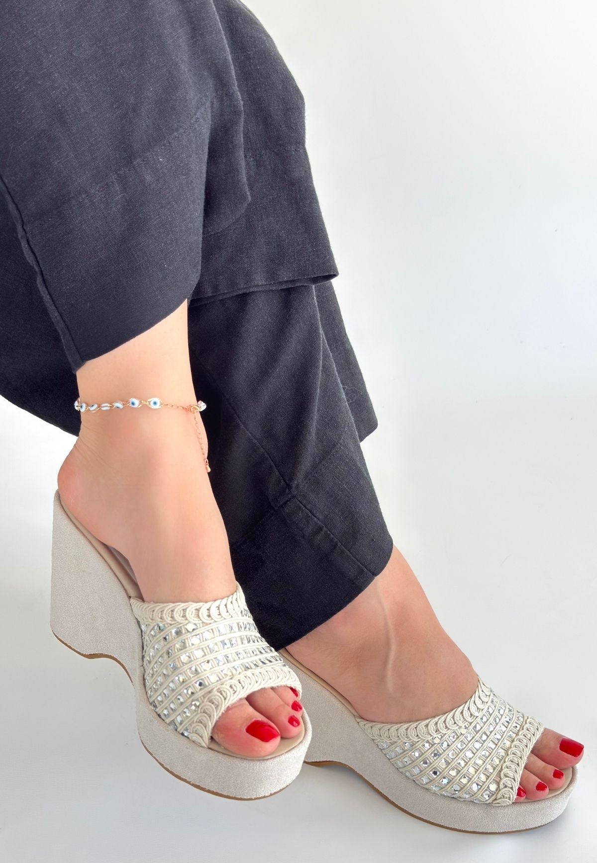 Dolgu Topuk Moka Bej Triko Dolgu Topuk Terlik