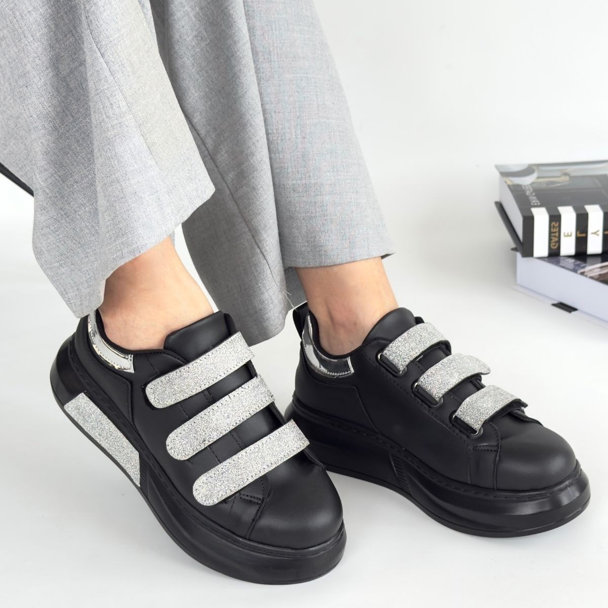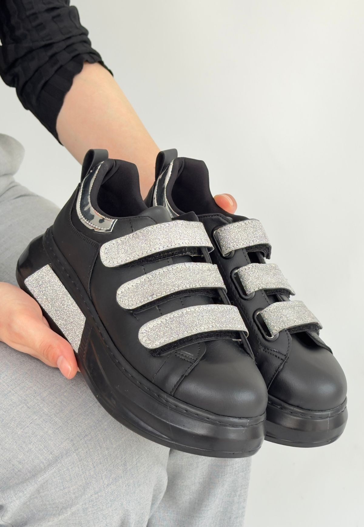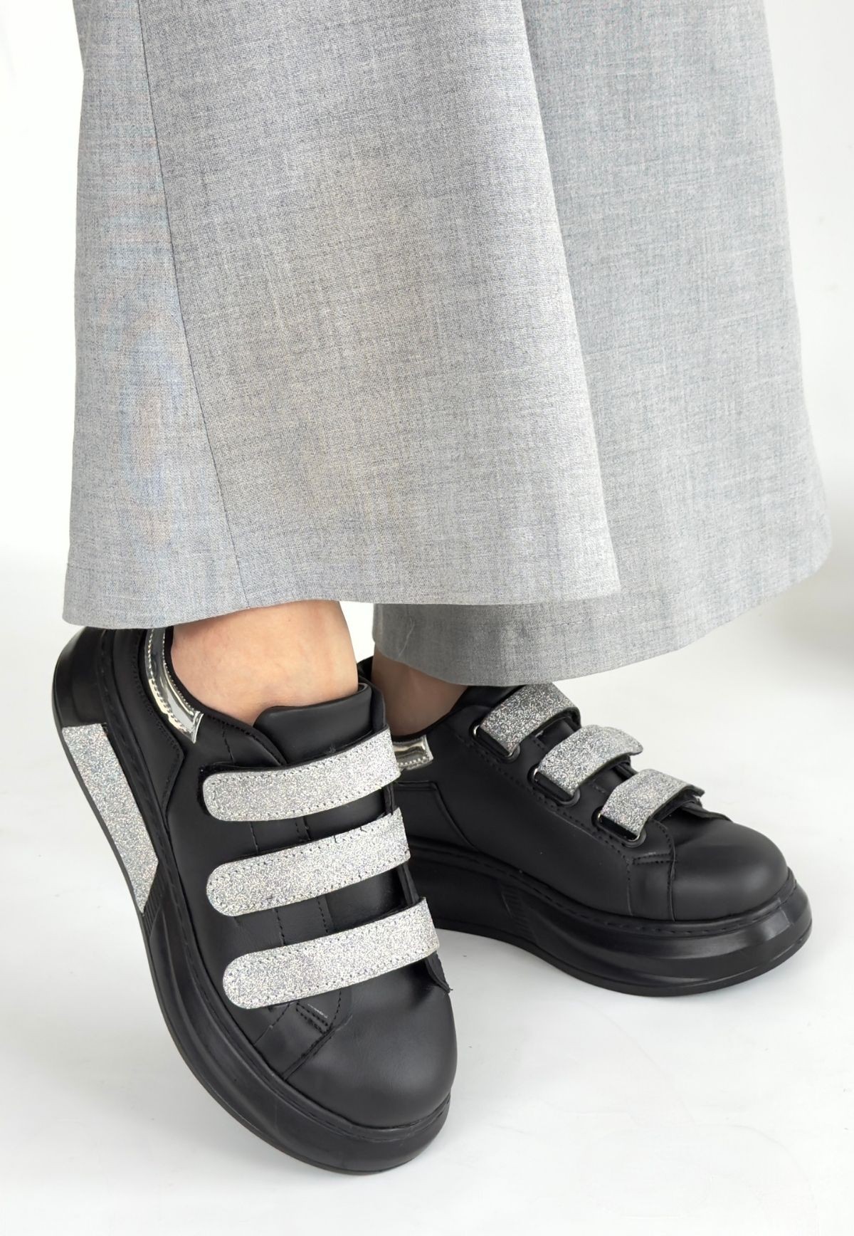 • Elika Siyah Cilt Simli Cırt Cırtlı Spor Ayakkabı