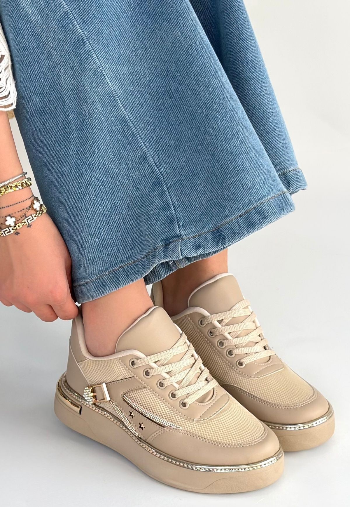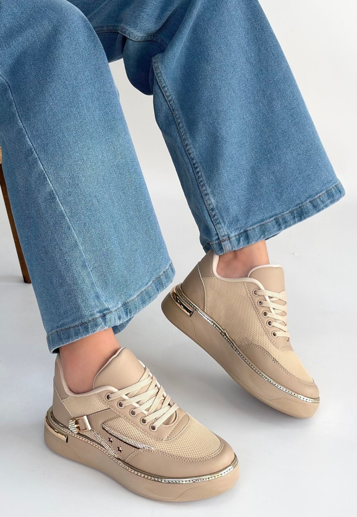 Junda Bej Cilt Bağcıklı Spor Ayakkabı