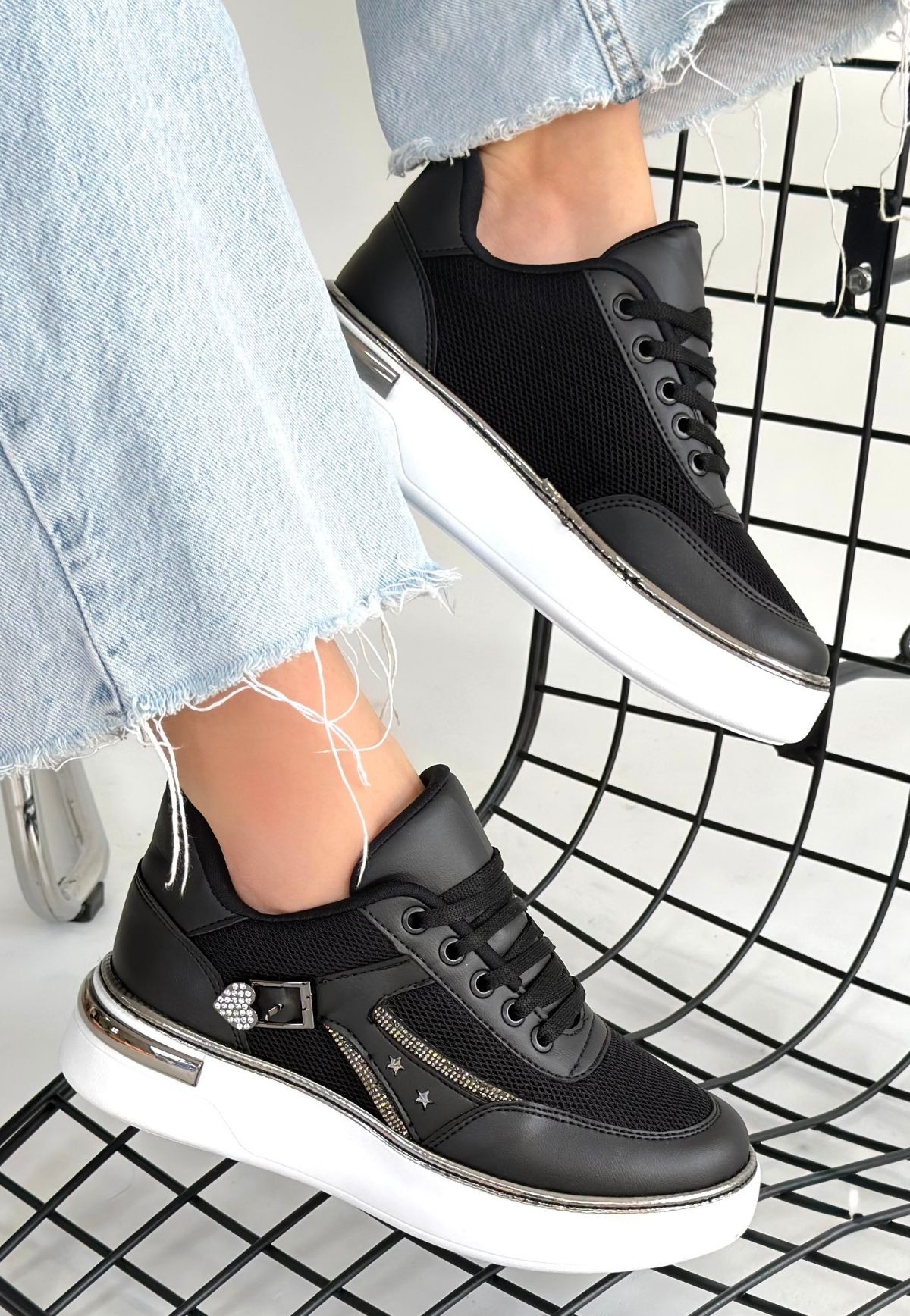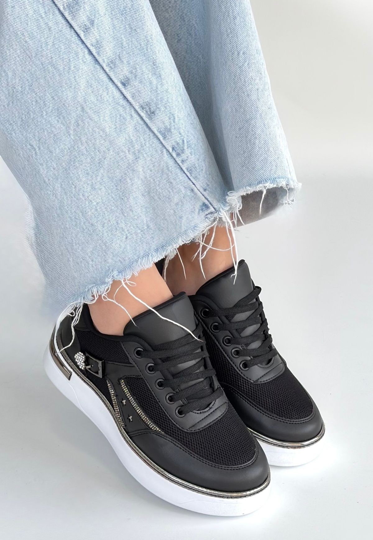 Junda Siyah Cilt Bağcıklı Spor Ayakkabı