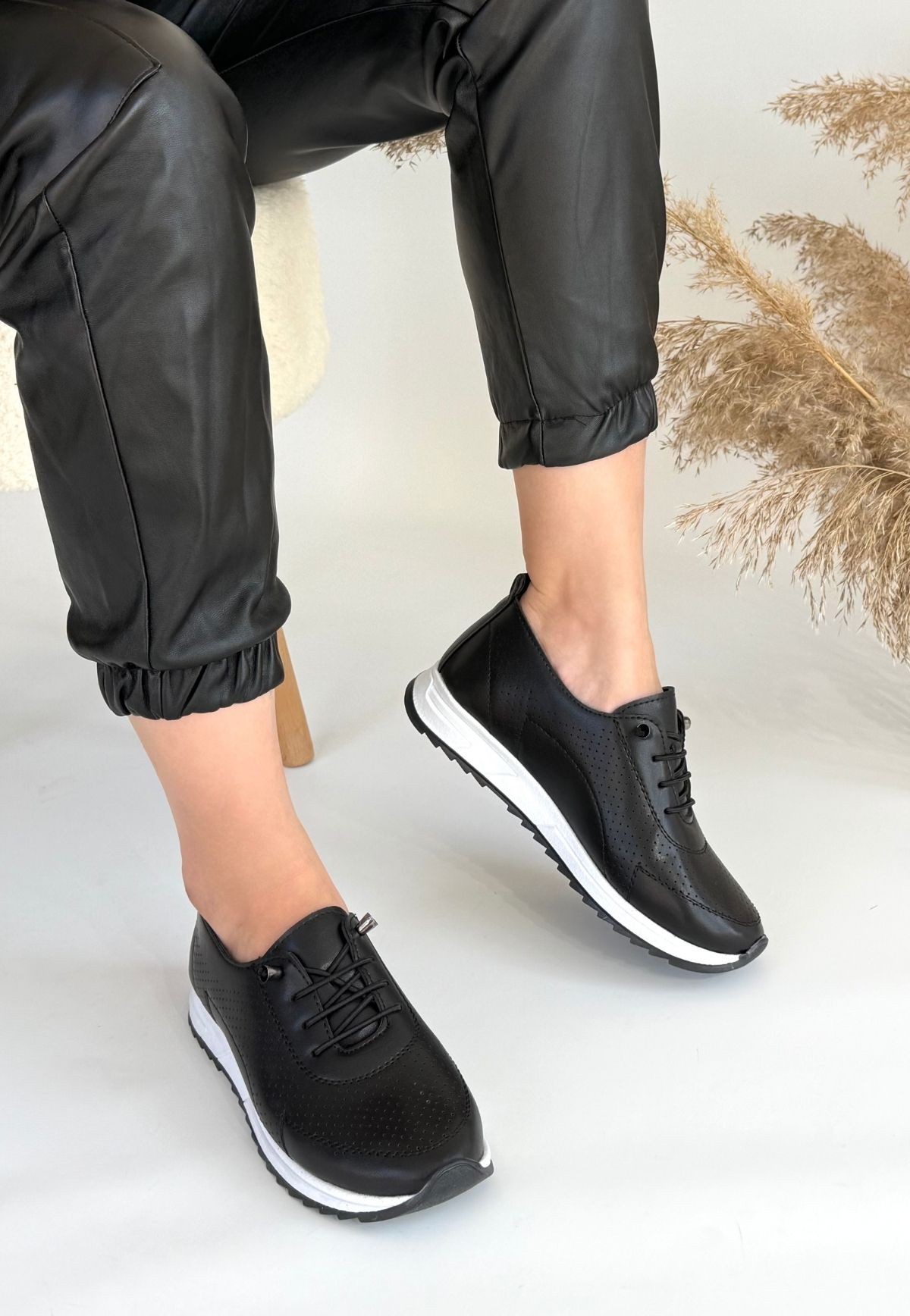 Kadın Spor Tone Siyah Cilt Bağcıklı Spor Ayakkabı