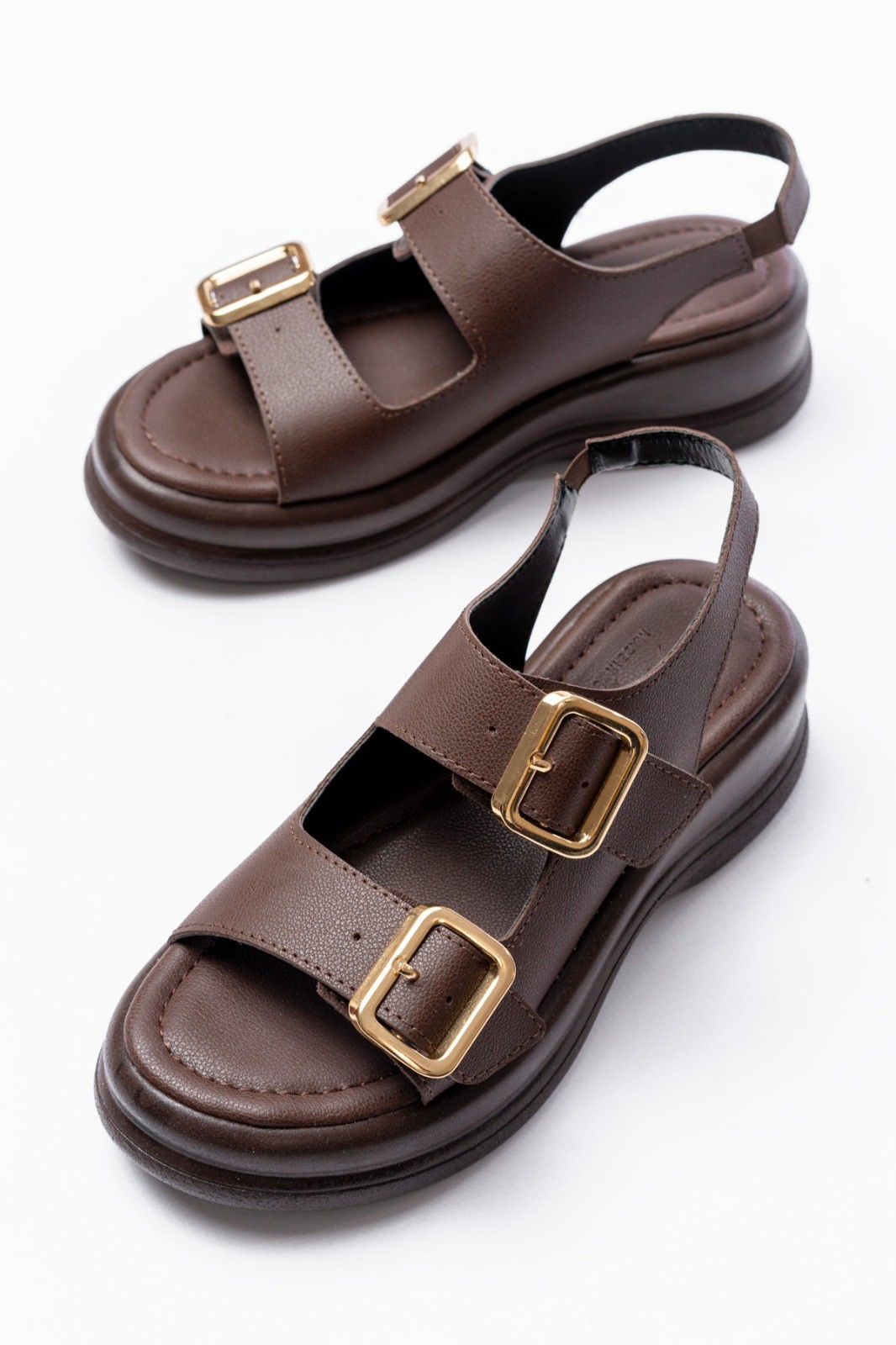 • Kaji Kahverengi Cilt Çift Tokalı Sandalet