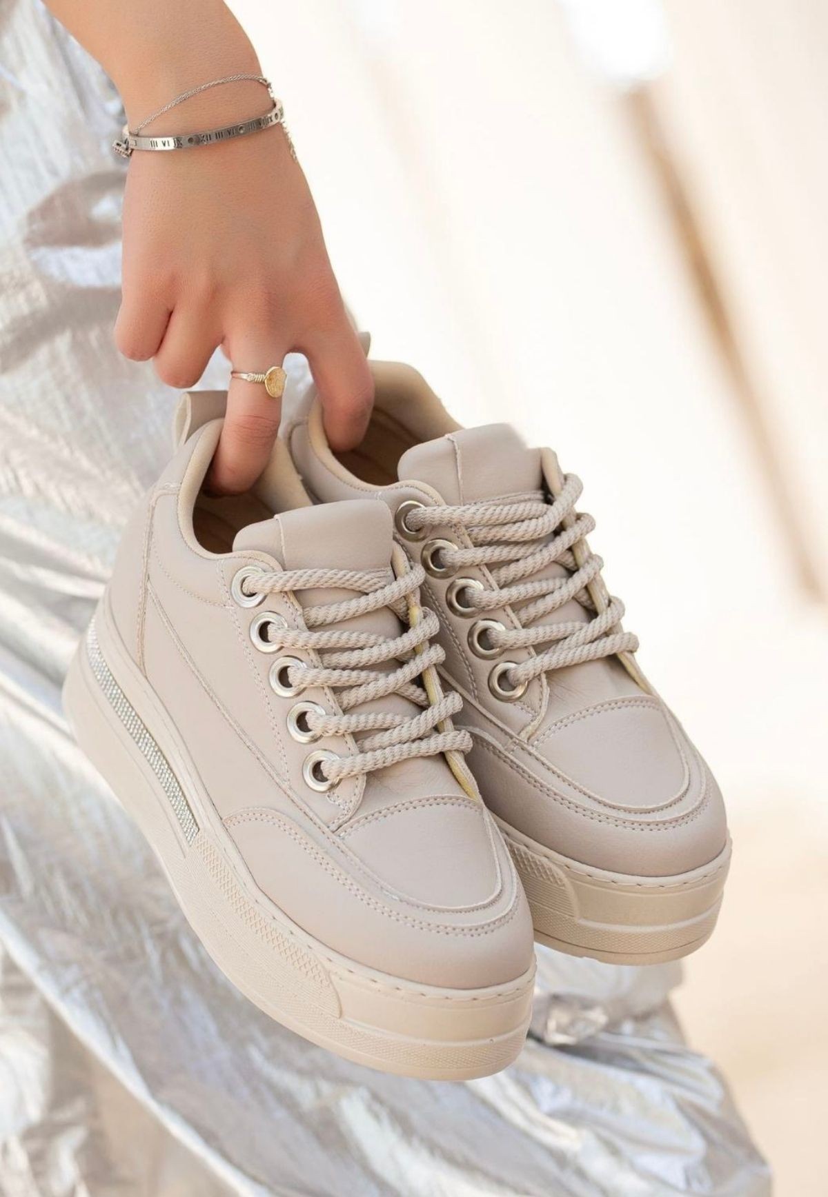 • Lulu Bej Cilt Bağcıklı Spor Ayakkabı