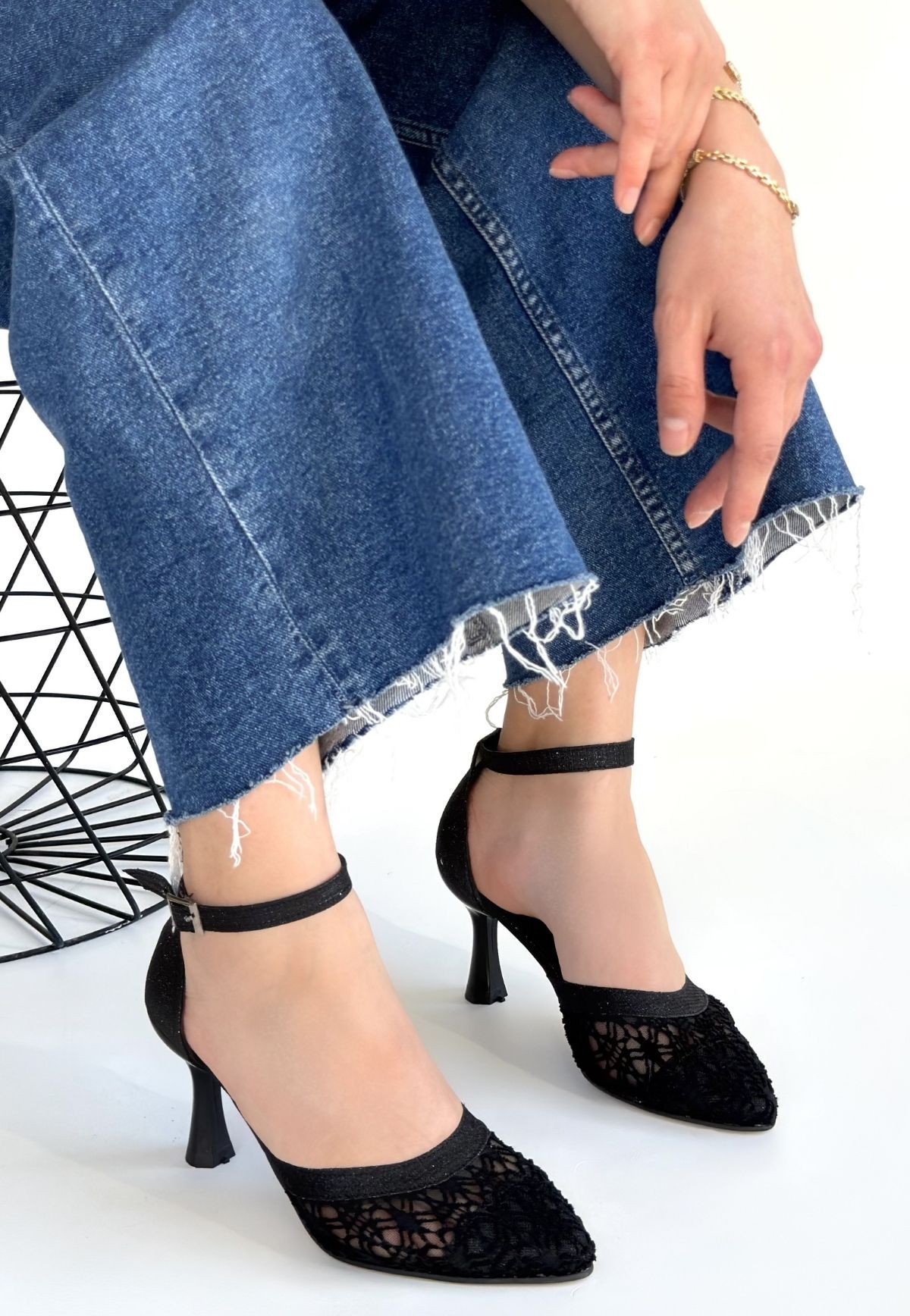 Weja Siyah Cilt Tül Detaylı Simli Topuklu Ayakkabı